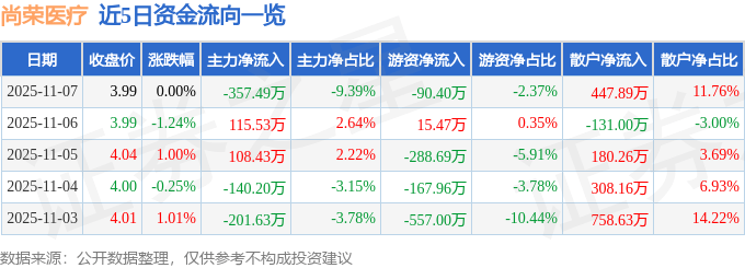 股票行情快报:尚荣医疗(002551)11月7日主力资金净卖出357.49万元