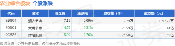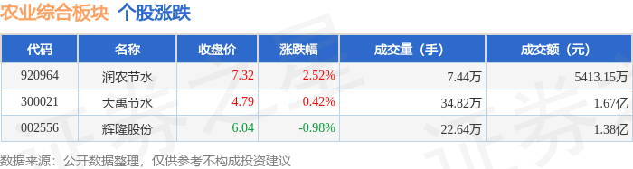 | 代码 | | | 名称 | | | | | --- | --- | --- | --- | --- | --- | --- | | 300021 大禹节水 | 809.41万 | 4.84% | -796.07万 | -4.76% | -13.34万 | -0.08% | | 920964 润农节水 | 552.77万 | 10.21% | 436.55万 | 8.06% | -75.51万 | -1.40% | | 002556 辉隆股份 | -866.47万 | -6.30% | 373.86万 | 2.72% | 492.62万 | 3.58% | 证券之星消息,1月13日农业综合板块较上一交易日下跌0.4%,辉隆股份领跌。当日上证指数报收于 4138.76,下跌0.64%。深证成指报收于14169.4,下跌1.37%。农业综合板块个股涨跌见下表: | 代码 | 名称 | 收盘价 | 涨跌幅 | 成交量(手) | 成交额(元) | | | --- | --- | --- | --- | --- | --- | --- | | 920964 | 润农节水 | 7.32 | 2.52% | 7.44万 ...