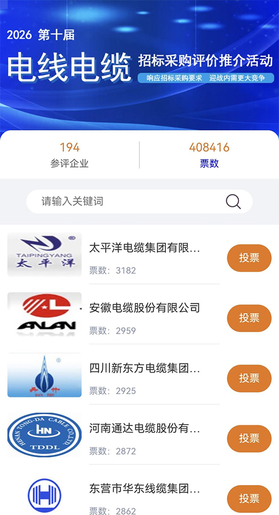 行业竞争格局 - 当前电线电缆行业市场竞争激烈且高度分化,呈现典型的“金字塔”结构[1] - 行业顶端是少数技术实力雄厚的大型龙头企业,在高技术、高附加值的特种电缆、海缆、高压超高压领域占据优势,参与国家重大工程和全球竞争[1] - 行业中部是大量中型企业,在细分市场或区域市场有一定竞争力[1] - 行业底层是数量众多的中小型厂商,产品同质化严重,主要集中于低端低压电缆市场,价格竞争白热化[1] - 行业竞争核心已从单纯的价格战,转向“技术 + 品牌 + 供应链”的综合较量[1] - 关键竞争点包括:在新能源、海洋工程、特种材料等新兴领域的技术研发与突破能力[1] - 关键竞争点包括:在高端市场和重大项目中,品牌信誉与质量可靠性成为核心门槛[1] - 关键竞争点包括:通过规模化生产和精细化管理控制成本,以应对铜、铝等原材料价格波动[1] - 关键竞争点包括:项目垫资要求高,资金实力和销售网络至关重要[1] - 行业集中度在政策和市场需求升级驱动下逐步提升,“马太效应”加剧[1] - 龙头企业凭借技术、资金和品牌优势不断扩大市场份额[1] - 未来,智能化、绿色化及服务于新基建、智能电网的高端产品将成为主要增长点和竞争焦点[1] 行业评选活动 - 中国采购与招标网、中国名企排行网联合主办“2026(第10届)电线电缆招标采购评价推介活动”,主题为“响应招标采购要求、迎战更大内需竞争”[2] - 活动旨在助力优秀诚信的电线电缆供应商提升品牌价值和强化品牌优势,在招标采购市场中获得更多份额[2] - 活动已进入网上展示和投票阶段,投票时间为1月15日至1月30日[2] - 截至1月16日9:42分,网上共展示194家参评企业,总票数为408,416票[3] - 最终得票最高的前10名将获得“网络人气奖”[2] 领先企业概况 - **太平洋电缆集团有限公司**:始建于1985年,总部位于安徽无为,产品体系完善,涵盖电力电缆、电气装备用电缆、特种电缆等众多品类,拥有省级技术中心和多项国家专利[6] - **安徽电缆股份有限公司**:高新技术企业,总部位于安徽天长,隶属于中国核工业集团有限公司,是核级电缆的领军企业之一,拥有国家级企业技术中心和博士后科研工作站[7] - **四川新东方电缆集团有限公司**:总部位于四川成都,产品涵盖高压/超高压电力电缆、特种电缆等,业务覆盖全国,积极参与国家西部大开发及“新基建”相关重点工程[8] - **河南通达电缆股份有限公司**:股票代码002560,总部位于河南偃师,是国内主要的超高压、特高压架空导线生产企业之一,在钢芯铝绞线、铝合金绞线等细分领域技术领先[9] - **东营市华东线缆集团有限公司**:总部位于山东东营,产品体系全面,涵盖35kV及以下电力电缆、电气装备用电缆、特种电缆等系列,是山东省内具有较强竞争力的企业[10] - **建业电缆集团有限公司**:产品体系涵盖电力电缆、电气装备用电缆、特种电缆及家装布电线等系列,积极参与国家及行业标准制定[11][12] - **齐鲁电缆有限公司**:高新技术企业,总部位于山东省,产品线丰富,涵盖35kV及以下电力电缆、特种电缆等系列,在区域市场有稳固的品牌影响力[13] - **广东新亚光电缆实业有限公司**:总部位于广东清远,是国内电线电缆行业的重点骨干企业之一,拥有省级企业技术中心和先进的智能化生产线,深度参与众多国家级重点工程[14] - **四川兴川泰线缆有限公司**:总部位于四川成都,产品体系齐全,涵盖电力电缆、电气装备用电缆、特种电缆等系列,深耕西南市场[15] - **桂林国际电线电缆集团有限责任公司**:前身可追溯至1954年,总部位于广西桂林,是广西规模最大、产品系列最全的电线电缆生产企业之一,拥有国家级企业技术中心,产品远销海外[16]