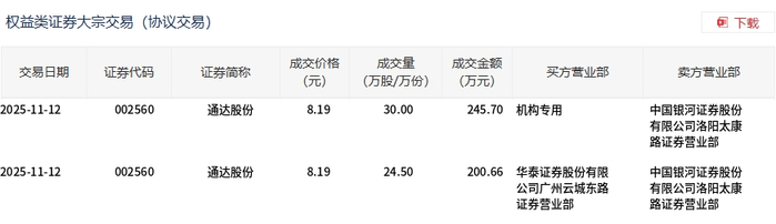 大宗交易概况 - 2025年11月12日,通达股份发生大宗交易,总成交54.5万股,总成交金额446.36万元,占当日总成交额的2.02% [1] - 成交价格为每股8.19元,较当日市场收盘价9元折价9% [1] 交易明细分析 - 当日共发生两笔大宗交易,第一笔成交30万股,成交金额245.70万元,买方为机构专用席位,卖方为中国银河证券股份有限公司洛阳太康路证券营业部 [2] - 第二笔成交24.5万股,成交金额200.66万元,买方为华泰证券股份有限公司广州云城东路证券营业部,卖方同样为中国银河证券股份有限公司洛阳太康路证券营业部 [2] - 两笔交易价格均为每股8.19元 [2]