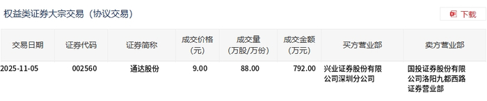 大宗交易概况 - 2025年11月5日,通达股份发生大宗交易,成交88万股,成交金额792万元 [1] - 该笔大宗交易占公司当日总成交额的1.66% [1] - 成交价格为每股9.00元,较市场收盘价9.13元折价1.42% [1][2] 交易细节 - 买方营业部为兴业证券股份有限公司深圳分公司 [2] - 卖方营业部为国投证券股份有限公司洛阳九都西路证券营业部 [2] - 交易类型为权益类证券大宗交易(协议交易)[2]
