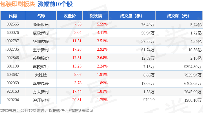 包装印刷板块市场表现 - 11月5日包装印刷板块整体上涨0.88%,表现优于上证指数(上涨0.23%)和深证成指(上涨0.37%)[1] - 顺灏股份以5.59%的涨幅领涨板块,收盘价为7.55元,成交量为76.49万手,成交额达5.74亿元[1] - 涨幅居前的个股包括康欣新材(上涨4.11%)、华源控股(上涨3.51%)和王子新材(上涨2.92%)[1] 个股涨跌情况 - 当日板块内10只个股上涨,10只个股下跌,显示内部分化[1][2] - 跌幅最大的个股为营兴股份,下跌3.13%,收盘价6.18元,成交71.77万手[2] - 鸿博股份下跌2.45%,收盘价17.51元,成交额4.86亿元[2] 板块资金流向 - 包装印刷板块整体呈现主力资金净流出1608.91万元,游资资金净流出1.09亿元,但散户资金净流入1.25亿元[2] - 王子新材获得主力资金净流入7903.69万元,主力净占比达7.49%,为板块最高[3] - 英联股份主力资金净流入1975.15万元,主力净占比9.05%,但游资净流出2953.32万元[3] - 南王科技主力净流入1263.31万元,主力净占比高达13.37%[3]