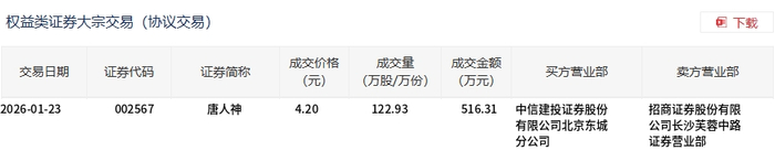 1月23日,唐人神大宗交易成交122.93万股,成交额516.31万元,占当日总成交额的4.94%,成交价4.2 元,较市场收盘价4.29元折价2.1%。 | 交易日期 | 证券代码 | 证券简称 | 成交价格 | 成交量 | 成交金额 | 买方营业部 | 卖方营业部 | | --- | --- | --- | --- | --- | --- | --- | --- | | | | | (元) | (万股/万份) | (万元) | | | | 2026-01-23 | 002567 | 唐人神 | 4.20 | 122.93 | 516.31 | 中信建投证券股份 | 招商证券股份有限 | | | | | | | | 有限公司北京东城 | 公司长沙美蓉中路 | | | | | | | | 分公司 | 证券营业部 | ...