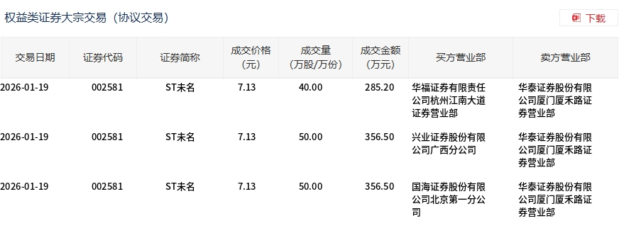 1月19日,ST未名(维权)大宗交易成交140万股,成交额998.2万元,占当日总成交额的36.96%,成交价7.13元,较市场收 盘价7.5元折价4.93%。 | 交易日期 | 证券代码 | 证券简称 | 成交价格 | | 成交量 | 买方营业部 | 卖方营业部 | | --- | --- | --- | --- | --- | --- | --- | --- | | | | | (元) | (万股/万份) | (万元) | | | | 2026-01-19 | 002581 | ST未名 | 7.13 | 40.00 | 285.20 | 华福证券有限责任 | 华泰证券股份有限 | | | | | | | | 公司杭州江南大道 | 公司厦门厦禾路证 | | | | | | | | 证券营业部 | 弟营亦凯 | | 2026-01-19 | 002581 | ST未名 | 7.13 | 50.00 | 356.50 | 兴业证券股份有限 | 华泰证券股份有限 | | | | | | | | 公司广西分公司 | 公司厦门厦未路证 | | | | | | | | | 券营业部 | | 2026-01-19 | ...