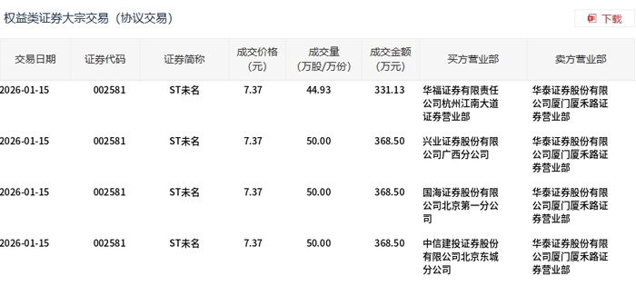 1月15日,ST未名大宗交易成交194.93万股,成交额1436.63万元,占当日总成交额的29.1%,成交价7.37 元,较市场收盘价7.74元折价4.78%。 | 交易日期 | 证券代码 | 证券简称 | 成交价格 | 成交量 | 成交全额 | 买方营业部 | 卖方营业部 | | --- | --- | --- | --- | --- | --- | --- | --- | | | | | (元) | (万股/万份) | (万元) | | | | 2026-01-15 | 002581 | ST未名 | 7.37 | 44.93 | 331.13 | 华福证券有限责任 | 华泰证券股份有限 | | | | | | | | 公司杭州江南大道 | 公司厦门厦禾路证 | | | | | | | | 证券营不部 | 学营业部 | | 2026-01-15 | 002581 | ST未名 | 7.37 | 50.00 | 368.50 | 兴业证券股份有限 | 华泰证券股份有限 | | | | | | | | 公司广西分公司 | 公司厦门厦禾路证 | | | | | | | | | 券营业部 | | 2026-01 ...