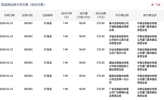 | 交易日期 | 证券代码 | 证券简称 | 成交价格 | 成交量 | 成交金额 | 买方营业部 | 卖方营业部 | | --- | --- | --- | --- | --- | --- | --- | --- | | | | | (元) | (万股/万份) | (万元) | | | | 2026-01-13 | 002581 | ST未名 | 7.44 | 50.00 | 372.00 | 南兴证券有限公司 | 华泰证券股份有限 | | | | | | | | 宁波和源路证券营 | 公司厦门厦禾路证 | | | | | | | | ना च्छ | 芽营业部 | | 2026-01-13 | 002581 | ST未名 | 7.44 | 50.00 | 372.00 | 华福证券有限责任 | 华泰证券股份有限 | | | | | | | | 公司杭州江南大道 | 公司厦门厦禾路证 | | | | | | | | 证券营业部 | 学营业部 | | 2026-01-13 | 002581 | ST未名 | 7.44 | 50.00 | 372.00 | 兴业证券股份有限 | 华泰证券股份有限 | | | | ...