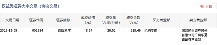 | 权益类证券大宗交易 (协议交易) | | | | | | | 6 下载 | | --- | --- | --- | --- | --- | --- | --- | --- | | 交易日期 | 证券代码 | 证券简称 | 成交价格 (元) | 成交量 (万股/万份) | 成交金额 (万元) | 买方营业部 | 卖方营业部 | | 2025-12-05 | 002584 | 西陇科学 | 8.24 | 26.52 | 218.49 机构专用 | | 国联民生证券股份 有限公司广州华夏 路正差量不部 | 12月5日,西陇科学大宗交易成交26.52万股,成交额218.49万元,占当日总成交额的0.72%,成交价8.24 元,较市场收盘价9.06元折价9.05%。 ...