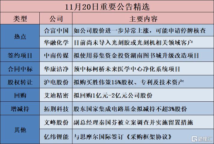 热点事件 - 合富中国表示若公司股价进一步异常上涨可能申请停牌核查[1][1] - 华融化学澄清目前尚未导入光刻胶或光刻机相关领域客户[1][1] 项目投资与签约 - 中南传媒拟使用募集资金投资湖南图书城升级改造项目[1][1] - 上海机场向机场集团转让浦东机场三期扩建相关捷运资产[1] - *ST围海签订3.13亿元重大合同[1] - 青龙管业中标彭阳县王洼片区供水工程-输配水工程二标段[1] - 青龙管业中标2.94亿元项目[1] - 华康洁净预中标柯桥未来医学中心净化系统项目[1][1] 股权收购与转让 - 沪电股份拟购买胜伟策15%股权、专利及技术资产[1][1] - 东方雨虹拟收购Novakem 60%股权以助力公司立足巴西并拓展拉美市场[1] - 莱克电气拟将精密机械90%股权转让给创元资源[1] 股份回购 - 天合光能累计回购2.1715%公司股份[4] - 航材股份拟斥资5000万元至1亿元回购股份[4] - 艾迪精密拟回购1亿元至2亿元公司股份[1][4] 股东增减持 - 龙迅股份股东合肥中安拟减持不超过1.8623%股份[4] - 华亚智能多名股东拟合计减持不超过2.98%股份[4] - 挖金客实际控制人李征拟减持不超过3%股份[4] - 拓荆科技股东国家集成电路基金拟减持不超3%股份[1][4] - 飞沃科技实际控制人控制的企业拟增持4000万元至7000万元公司股份[4] 公司治理与其他 - 文峰股份副总经理秦国芬被立案调查并实施留置措施[1][4] - 亿纬锂能与思摩尔国际签订《采购框架协议》[1][4]