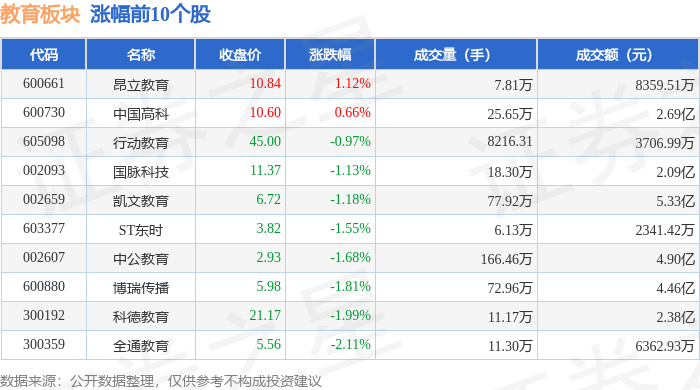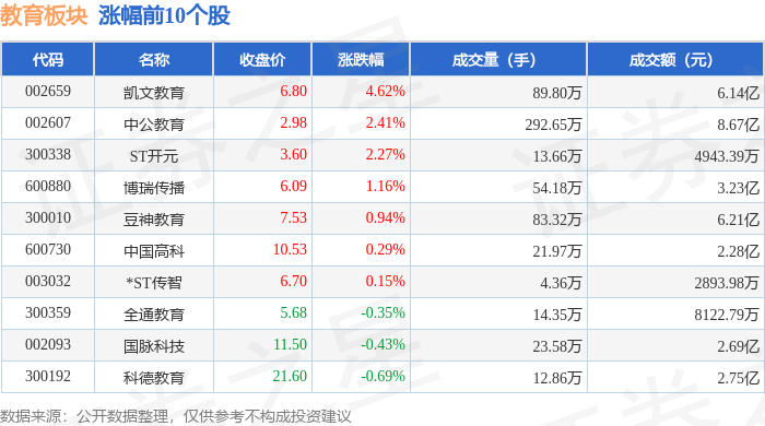 | 代码 | 名称 | 主力净流入(元) | 主力净占比 游资净流入(元) | | 游资净占比 散户净流入(元) | | 散户净占比 | | --- | --- | --- | --- | --- | --- | --- | --- | | 600661 | 昂立教育 | 1731.05万 | 20.71% | -366.37万 | -4.38% | -1364.68万 | -16.32% | | 600880 博瑞传播 | | 1408.57万 | 3.16% | 368.21万 | 0.83% | -1776.78万 | -3.98% | | 600730 中国高科 | | 1175.69万 | 4.37% | 575.88万 | 2.14% | -- - 1751.58万 | -6.51% | | 003032 | *ST传智 | -111.11万 | -2.67% | -69.85万 | -1.68% | 180.96万 | 4.35% | | 605098 行动教育 | | -165.45万 | -4.46% | 135.95万 | 3.67% | 29.50万 | 0.80% | | 603377 ...