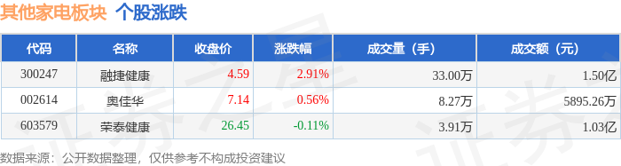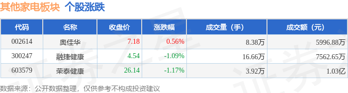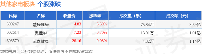 | 代码 | 名称 | 收盘价 | 涨跌幅 | 成交量(手) | 成交额(元) | | | --- | --- | --- | --- | --- | --- | --- | | 300247 | 融捷健康 | 4.83 | 6.39% | 75.84万 | | 3.59亿 | | 002614 | 奥佳华 | 7.23 | 0.70% | 13.91万 | | 1.01亿 | | 603579 | 荣泰健康 | 26.16 | 0.08% | 4.32万 | | 1.14亿 | 证券之星消息,11月12日其他家电板块较上一交易日上涨2.14%,融捷健康领涨。当日上证指数报收于 4000.14,下跌0.07%。深证成指报收于13240.62,下跌0.36%。其他家电板块个股涨跌见下表: | 代码 | | | 名称 主力净流入(元) 主力净占比 游资净流入(元) 游资净占比 散户净流)(元) 散户净占比 | | | | | --- | --- | --- | --- | --- | --- | --- | | 300247 融捷健康 | 916.10万 | 2.55% | 564.16万 | 1.57% | - ...