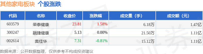 | 代码 | 名称 | 收盘价 | 涨跌幅 | 成交量(手) | 成交额(元) | | | --- | --- | --- | --- | --- | --- | --- | | 603579 | 荣泰健康 | 23.81 | 1.58% | 6.18万 | | 1.47 Z | | 300247 | 融捷健康 | 5.13 | 0.00% | 21.50万 | | 1.11亿 | | 002614 | 奥佳化 | 7.31 | -0.81% | 15.12万 | | 1.11亿 | 证券之星消息,12月31日其他家电板块较上一交易日上涨0.4%,荣泰健康领涨。当日上证指数报收于 3968.84,上涨0.09%。深证成指报收于13525.02,下跌0.58%。其他家电板块个股涨跌见下表: | 代码 | | | 名称 │主力净流入(元)│主力净占比│游资净流入(元)│游资净占比│散户净流入(元)│散户净占比 | | | | | --- | --- | --- | --- | --- | --- | --- | | 603579 荣泰健康 | 689.24万 | 4.70% | 813.89万 | 5.55% | ...