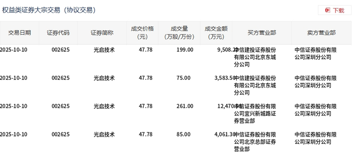 | 交易日期 | 证券代码 | 证券简称 | 成交价格 | 成交量 | 成交会额 买方营业部 | 卖方营业部 | | --- | --- | --- | --- | --- | --- | --- | | | | | (元) | (万股/万份) | (万元) | | | 2025-10-10 | 002625 | 光启技术 | 47.78 | 199.00 | 9,508.2 信建投证券股份 | 中信证券股份有限 | | | | | | | 有限公司北京东城 | 公司深圳分公司 | | | | | | | 分公司 | | | 2025-10-10 | 002625 | 光启技术 | 47.78 | 75.00 | 3,583.50中信建投证券股份 | 中信证券股份有限 | | | | | | | 有限公司北京东城 | 公司深圳分公司 | | | | | | | 分公司 | | | 2025-10-10 | 002625 | 光启技术 | 47.78 | 261.00 | 12,470中辖证券股份有限 | 中信证券股份有限 | | | | | | | 公司宜兴新城路证 | 公司深圳分公司 | | | | | | ...