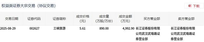 交易概况 - 2025年8月29日三峡旅游发生大宗交易,成交量为890万股,成交金额为4992.9万元,占当日总成交额的12.56% [1] - 成交价格为5.61元,较市场收盘价6.03元折价6.97% [1] 交易细节 - 证券代码为002627,证券简称为三峡旅游 [2] - 买方营业部为长江证券股份有限公司武汉武珞路证券营业部 [2] - 卖方营业部为长江证券股份有限公司武汉武珞路证券营业部 [2]