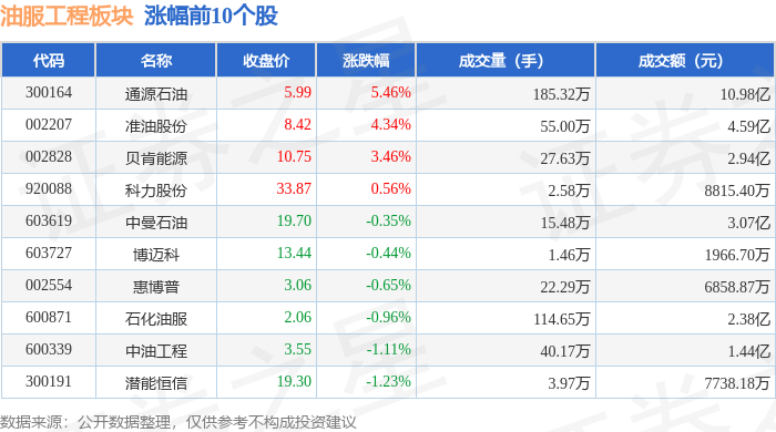 板块整体表现 - 油服工程板块在当日整体上涨0.67%,表现优于大盘,当日上证指数下跌0.62%,深证成指下跌2.54% [1] - 板块内个股多数上涨,领涨股为仁智股份,涨幅达9.99% [1] 领涨个股表现 - 仁智股份收盘价为8.48元,涨幅9.99%,成交量为24.97万手,成交额为2.01亿元 [1] - 中曼石油收盘价为20.19元,涨幅4.77%,成交量为26.70万手,成交额为5.36亿元 [1] - 科力股份收盘价为35.44元,涨幅3.41%,成交量为3.33万手,成交额为1.17亿元 [1] - 通源石油收盘价为5.85元,涨幅2.81%,成交量为125.06万手,成交额为7.28亿元 [1] 板块资金流向 - 油服工程板块整体获得主力资金净流入8077.16万元,但游资资金净流出1.3亿元,散户资金净流入4883.07万元 [2] - 仁智股份主力资金净流入最多,达5791.21万元,主力净占比为28.77% [3] - 通源石油主力资金净流入3300.39万元,主力净占比为4.54% [3] - 海油发展主力资金净流入1484.95万元,主力净占比为7.18% [3] 其他个股涨跌 - 部分个股出现下跌,石化油服下跌0.47%,潜能恒信下跌0.35%,中油工程下跌0.28% [2] - 海油发展股价持平,收盘价为3.96元,成交量为52.21万手,成交额为2.07亿元 [2]