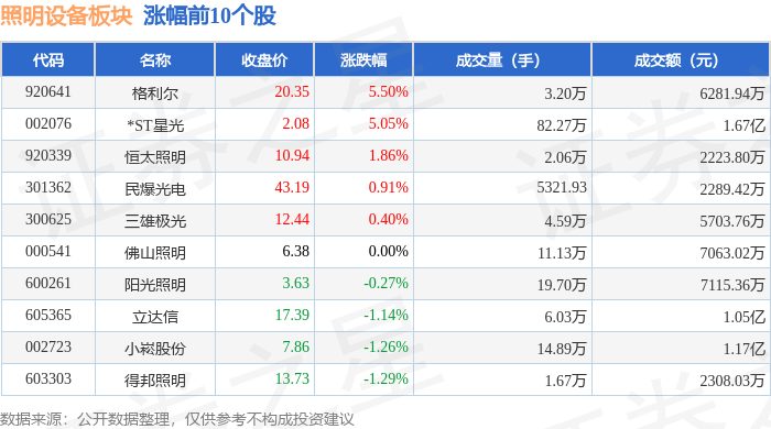 证券之星消息,10月29日照明设备板块较上一交易日下跌0.99%,海洋王领跌。当日上证指数报收于 4016.33,上涨0.7%。深证成指报收于13691.38,上涨1.95%。照明设备板块个股涨跌见下表: 从资金流向上来看,当日照明设备板块主力资金净流出3203.29万元,游资资金净流入804.32万元,散户 资金净流入2398.97万元。照明设备板块个股资金流向见下表: | 代码 | 名称 | 主力净流入(元) | 主力净占比 游资净流入 (元) | | 游资净占比 散户净流入 (元) | | 散户净占比 | | --- | --- | --- | --- | --- | --- | --- | --- | | 605365 | 立达信 | > 904.55万 | 8.63% | -179.16万 | -1.71% | -725.39万 | -6.92% | | 002076 | *ST星光 | 819.31万 | 4.91% | -74.49万 | -0.45% | -744.82万 | -4.46% | | 600261 | 阳光照明 | 365.40万 | 5.14% | -397.21万 | -5. ...