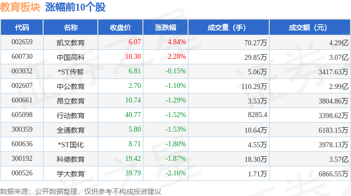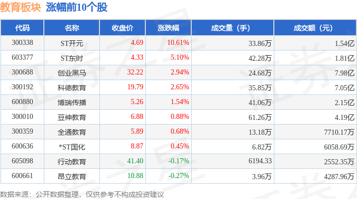 证券之星消息,11月18日教育板块较上一交易日上涨0.31%,ST开元领涨。当日上证指数报收于 3939.81,下跌0.81%。深证成指报收于13080.49,下跌0.92%。教育板块个股涨跌见下表: 从资金流向上来看,当日教育板块主力资金净流入1.0亿元,游资资金净流出925.27万元,散户资金净流 出9104.82万元。教育板块个股资金流向见下表: | 代码 | 名称 | 收盘价 | 涨跌幅 | 成交量(手) | | 成交额(元) | | --- | --- | --- | --- | --- | --- | --- | | 300338 | ST开元 | 4.69 | 10.61% | | 33.86万 | 1.54亿 | | 603377 | ST东时 | 4.33 | 5.10% | | 42.28万 | 1.81亿 | | 300688 | 创业题马 | 32.22 | 2.94% | | 24.68万 | 7.98亿 | | 300192 | 科德教育 | 19.79 | 2.65% | | 1 35.85万 | 7.05亿 | | 600880 | 博瑞传播 | 5.26 | 1.54% | ...
