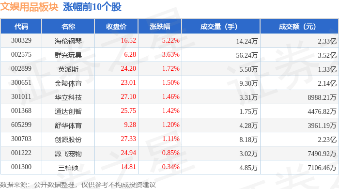 | 代码 | 名称 | 收盘价 | 涨跌幅 | 成交量(手) | 成交额(元) | | --- | --- | --- | --- | --- | --- | | 001238 | 浙江正特 | 49.33 | -3.08% | 8368.0 | 4190.98万 | | 301011 | 华立科技 | 25.65 | -2.88% | 3.24万 | 8356.58万 | | 002862 | 实丰文化 | 17.51 | -2.78% | 4.70万 | 8309.58万 | | 300703 | 创源股份 | 27.41 | -2.42% | 6.67万 | 1.84亿 | | 301335 | 天元宠物 | 29.22 | -2.21% | 2.26万 | 6656.51万 | | 002678 | 珠江钢琴 | 4.99 | -2.16% | 42.16万 | 2.13亿 | | 002575 | 群兴玩具 | 6.07 | -2.10% | 24.94万 | 1.53亿 | | 002348 | 高乐股份 | 4.27 | -1.61% | 18.20万 | 7816.30万 | | 002899 ...