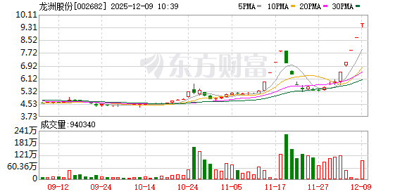 龙洲股份盘中涨停,已连收5个涨停板,截至9:31,该股报9.54元,换手率14.23%,成交量8003.73万 股,成交金额7.60亿元,涨停板封单金额为9.63亿元。连续涨停期间,该股累计上涨61.15%,累计换手 率为46.60%。最新A股总市值达53.65亿元,A股流通市值53.65亿元。 龙虎榜数据显示,该股因连续三个交易日内,涨幅偏离值累计达20%上榜龙虎榜1次,买卖居前营业部 中,机构净卖出3180.53万元,营业部席位合计净买入2.35亿元。(数据宝) | 日期 | 当日涨跌幅(%) | 换手率(%) | 主力资金净流入(万元) | | --- | --- | --- | --- | | 2025.12.08 | 10.03 | 0.78 | 3040.41 | | 2025.12.05 | 10.06 | 2.26 | 6839.66 | | 2025.12.04 | 9.98 | 8.10 | 12133.19 | | 2025.12.03 | 9.97 | 21.22 | 15516.68 | | 2025.12.02 | 2.78 | 19.95 | 1338.69 | | 2025.1 ...