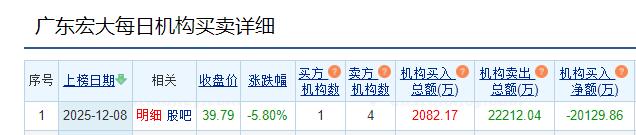 公司股价与交易表现 - 广东宏大股票于2025年12月8日收盘价为39.79元,单日跌幅为5.80% [1] - 当日龙虎榜数据显示,机构席位净卖出广东宏大金额为20129.86万元 [1] - 龙虎榜买入前五名总金额为19275.99万元,占总成交比例16.68%;卖出前五名总金额为32044.30万元 [4] 龙虎榜机构资金动向 - 在买入金额最大的前五名席位中,有1家为机构专用席位,买入金额2082.17万元,占总成交比例1.80% [1][4] - 在卖出金额最大的前五名席位中,有4家为机构专用席位,合计卖出金额22212.04万元 [1][2] - 机构专用席位呈现显著的净卖出态势,净卖出额达20129.86万元 [1][2] 龙虎榜主要交易席位详情 - 深股通专用席位为当日最活跃席位,买入11083.03万元(占总成交9.59%),同时卖出9657.63万元 [4] - 卖出方前四名均为机构专用席位,卖出金额分别为8973.73万元、5481.40万元、3088.03万元和2350.84万元 [4] - 买入方除机构专用席位外,还包括中国中金财富证券北京分公司(买入2535.24万元)、财信证券绍兴解放大道营业部(买入2052.93万元)等营业部席位 [4]