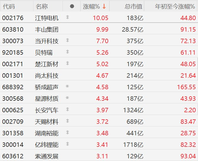 消息面上,央视称,固态电池作为下一代锂电池的核心技术方向,在新能源汽车、低空经济等领域具备 广阔的应用前景。针对这一前沿技术,我国科学家近期取得一批新进展。近日,中国科学家成功攻克全 固态金属锂电池的"卡脖子"难关,让固态电池性能实现跨越式升级,以前100公斤电池最多支持500公里 续航,如今有望突破1000公里天花板。 格隆汇10月16日|A股市场固态电池股午后拉升,其中,江特电机、丰山集团此前涨停,当升科技拉升 涨近8%,贝特瑞、尚太科技、星源材质等跟涨。 | 代码 | 名称 | | 涨幅% ↓ | 总市值 | 年初至今涨幅% | | --- | --- | --- | --- | --- | --- | | 002176 | 江特电机 | 1 | 10.05 | 183亿 | 44.80 | | 603810 | 丰山集团 | | 9.99 | 28.57亿 | 91.15 | | 300073 | 当升科技 | 1 | 7.70 | 375 Z | 72.13 | | 920185 | 贝特瑞 | + | 5.26 | 350亿 | 61.11 | | 002171 | 楚江新材 | 1 | 5.02 ...