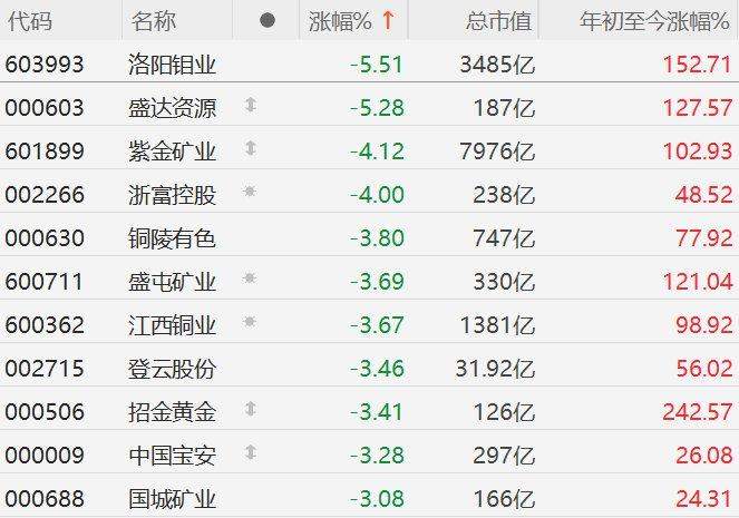 | 代码 | 名称 | . | 涨幅%↑ | 总市值 | 年初至今涨幅% | | --- | --- | --- | --- | --- | --- | | 603993 | 洛阳钳业 | | -5.51 | 3485亿 | 152.71 | | 000603 | 盛达资源 | 1 | -5.28 | 187亿 | 127.57 | | 601899 | 蒙令矿业 | 1 | -4.12 | 7976 Z | 102.93 | | 002266 | 浙富控股 | 策 | -4.00 | 238亿 | 48.52 | | 000630 | 铜陵有色 | | -3.80 | 747亿 | 77.92 | | 600711 | 盛屯矿业 | 策 | -3.69 | 330亿 | 121.04 | | 600362 | 江西铜业 | 演 | -3.67 | 1381亿 | 98.92 | | 002715 | 登云股份 | | -3.46 | 31.92亿 | 56.02 | | 000506 | 招金黄金 | 1 | -3.41 | 126亿 | 242.57 | | 000009 | 中国宝安 | 1 | -3. ...