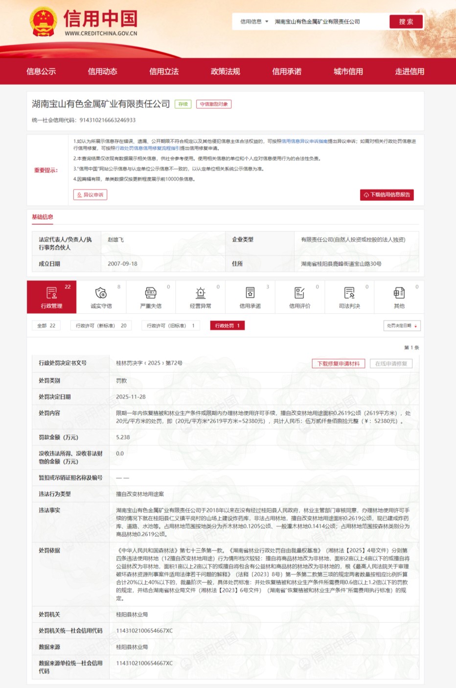 处罚事件概述 - 湖南宝山有色金属矿业有限责任公司因非法占用林地并改变用途,被桂阳县林业局处以罚款人民币52,380元,并被责令限期一年内恢复植被和林业生产条件或补办林地使用许可手续 [1] - 处罚决定书文号为“桂林罚决字﹝2025﹞第72号”,处罚决定日期为2025年11月28日 [1] 违法事实详情 - 公司自2018年以来,在未获审核同意、未办理林地使用许可手续的情况下,擅自在桂阳县仁义镇平岗村山场建设炸药库及相关设施 [1][3] - 非法占用林地总面积0.2619公顷(约2,619平方米或3.93亩),其中乔木林地0.1205公顷、一般灌木林地0.1414公顷,森林类别均为商品林地 [1][3] - 涉事地块已建成炸药库、道路、水池等设施,改变了林地原有用途 [1][3] 处罚依据与标准 - 处罚依据为《中华人民共和国森林法》第七十三条第一款及《湖南省林业行政处罚自由裁量权基准》(湘林法〔2025〕4号) [2][3] - 违法行为被认定为“擅自改变商品林地用途”,面积达2亩以上,裁量阶次为“一般” [2][3] - 罚款标准参照“恢复植被和林业生产条件所需费用0.6倍以上1.2倍以下”的规定,并结合湖南省相关执行标准(湘林法〔2023〕6号),最终按20元/平方米计算,合计罚款52,380元 [2][3] 公司背景信息 - 湖南宝山有色金属矿业有限责任公司成立于2007年9月18日,法定代表人为赵雄飞,注册资本为29,607万元 [3] - 公司注册地址位于湖南省桂阳县,所属行业为有色金属矿采选业 [3] - 公司为A股上市公司湖南白银(股票代码002716)股份有限公司的全资子公司 [3]