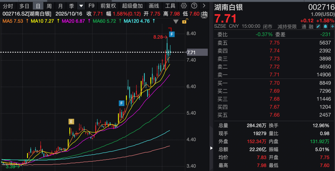 股份回购方案调整 - 公司宣布调整回购股份方案 回购价格上限由7元/股调整为8元/股 [1] - 回购股份数量区间为1755万股至2138万股 回购资金总额调整为不低于9260.06万元且不超过1.23亿元 [1] - 本次调整旨在确保限制性股票激励计划顺利推进 是基于公司近期股价表现及市场情况的审慎决定 [1][2] 股价表现与市场行情 - 自今年6月1日以来 公司股价累计涨幅超过124% 最新报收7.71元/股 总市值218亿元 [2] - 贵金属市场价格大幅上涨是推动公司股价上涨的重要原因 [2] - 截至10月16日 公司已累计回购股份1755万股 占总股本的0.35% 最高成交价6.74元/股 最低成交价4.47元/股 成交总金额9260万元 [1] 公司主营业务与经营业绩 - 公司主营业务为白银 电解铅 黄金 电积铜 银制品等有色金属及贵金属产品的冶炼和销售 [3] - 2025年上半年营业收入45.29亿元 同比增长35.59% 归母净利润6219.69万元 同比增长7.01% 扣非归母净利润5092.53万元 同比增长367.41% [4] - 业绩增长得益于管理层聚焦主业 推进精细化管理 提升产品产量及技术指标 同时开展降本增效工作 有效控制成本 [4]