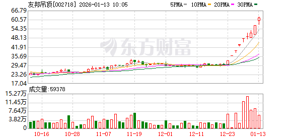 | 日期 | 当日涨跌幅(%) | 换手率(%) | 主力资金净流入(万元) | | --- | --- | --- | --- | | 2026.01.06 | 9.99 | 4.63 | 1546.01 | | 2026.01.05 | 9.99 | 12.69 | -2498.12 | | 2025.12.31 | 10.01 | 1.12 | 1359.37 | | 2025.12.23 | 10.00 | 11.80 | 2607.23 | | 2025.12.22 | -1.72 | 4.28 | 84.56 | | 2025.12.19 | 4.14 | 4.26 | -23.88 | | 2025.12.18 | -2.62 | 4.86 | -1146.73 | | 2025.12.17 | 2.05 | 3.59 | 123.26 | | 2025.12.16 | -4.11 | 4.83 | 101.14 | | 2025.12.15 | 4.25 | 4.71 | 72.51 | (文章来源:证券时报网) 友邦吊顶盘中涨停,已连收4个涨停板,截至9:25,该股报47.83元,换手率0. ...