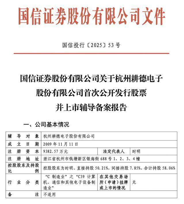 公司基本情况 - 公司全称为杭州耕德电子股份有限公司,成立于2009年11月11日 [2][4] - 公司注册资本为9382.57万元,法定代表人为时明 [2][4] - 公司注册地址位于浙江省杭州市钱塘新区银海街688号1、2、3、4幢 [2][4] 股权结构与控制权 - 控股股东为时明,直接持股比例为50.21%,间接持股比例为7.85%,合计持股比例为58.06% [2][3][4] - 时明目前担任公司董事长 [3] 行业分类与业务定位 - 公司行业分类为“C制造业”之“C39计算机、通信和其他电子设备制造业” [2][4] - 公司是一家专注于精密电子结构件研发与生产的高新技术企业 [2] - 公司主营业务为移动通讯及其附属品的开发、模具设计、模具加工及手机结构件 [3] - 公司业务同时涉足智能穿戴设备、医疗器械市场、汽车部件制造等领域 [3] 技术实力与生产制程 - 公司累计获得117项专利、40项软件著作权 [3] - 公司拥有CNC加工中心、检测中心 [3] - 主要制程包括模具开发/设计/加工、CNC、抛光、阳极、组装等 [3] 首次公开募股相关 - 公司本次IPO的辅导机构为国信证券股份有限公司 [2] - 律师事务所为北京市金杜律师事务所,会计师事务所为天健会计师事务所(特殊普通合伙) [2] - 公司未在其他交易场所挂牌或申请上市 [2][4]