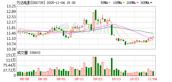 11月5日,万达电影盘中上涨2.24%,截至13:32,报11.42元/股,成交4.30亿元,换手率1.82%,总市值 241.17亿元。 资金流向方面,主力资金净流入2258.28万元,特大单买入5396.81万元,占比12.54%,卖出3161.64万 元,占比7.35%;大单买入1.10亿元,占比25.64%,卖出1.10亿元,占比25.59%。 万达电影今年以来股价跌5.93%,近5个交易日涨4.10%,近20日跌7.23%,近60日跌0.95%。 今年以来万达电影已经1次登上龙虎榜,最近一次登上龙虎榜为2月17日,当日龙虎榜净买入3915.19万 元;买入总计2.86亿元 ,占总成交额比15.52%;卖出总计2.47亿元 ,占总成交额比13.40%。 资料显示,万达电影股份有限公司位于北京市朝阳区八里庄东里1号莱锦文化创意产业园CN02楼,成立 日期2005年1月20日,上市日期2015年1月22日,公司主营业务涉及影院投资建设、院线电影发行、影院 电影放映及相关衍生业务(卖品销售、广告发布等),电影、电视剧的投资、制作和发行,以及网络游戏发 行和运营领域。主营业务收入构成为:观影收入62.45%, ...