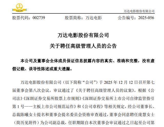 公司人事任命 - 万达电影董事会审议通过聘任庞慧为公司副总裁 其任职期限自董事会审议通过之日起至公司第七届董事会届满之日止 [3] - 新任副总裁庞慧于2024年6月加入万达电影 此前拥有超过16年的互联网业务及经营管理经验 曾长期就职于阿里巴巴集团 [3] 公司财务表现 - 2025年前三季度 公司实现归属于上市公司股东的净利润7.08亿元 同比增长319.92% [3] - 2025年第三季度单季 公司实现归属于上市公司股东的净利润1.73亿元 同比增长212.04% [3] 公司经营与市场地位 - 2025年第三季度 公司直营影院票房为18.8亿元 市场份额达到14.8% [4] 行业市场状况 - 2025年第三季度 全国电影票房达到127.2亿元 同比增长17.2% [4] - 2025年第三季度 全国观影人次达到3.4亿 同比增长29.8% [4]