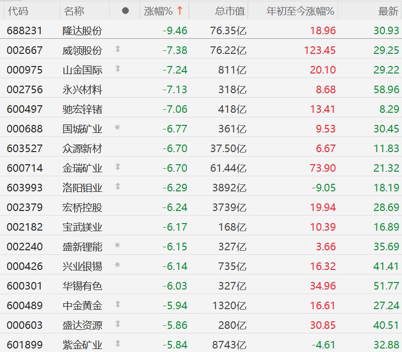 有色金属股集体下挫,洛阳钼业、兴业银锡跌超6%
