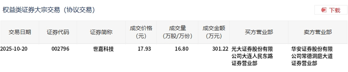 10月20日,世嘉科技大宗交易成交16.8万股,成交额301.22万元,占当日总成交额的1.23%,成交价 17.93元,较市场收盘价17.93元持平。 | 交易日期 | 证券代码 | 证券简称 | 成交价格 | 成交量 | 成交金额 买方营业部 | 卖方营业部 | | --- | --- | --- | --- | --- | --- | --- | | | | | (元) | (万股/万份) | (万元) | | | 2025-10-20 | 002796 | 世喜科技 | 17.93 | 16.80 | 301.22 光大证券股份有限 | 华安证券股份有限 | | | | | | | 公司大连人民东路 | 公司常德洞庭大道 | | | | | | | 证券营业部 | 证券营业部 | ...