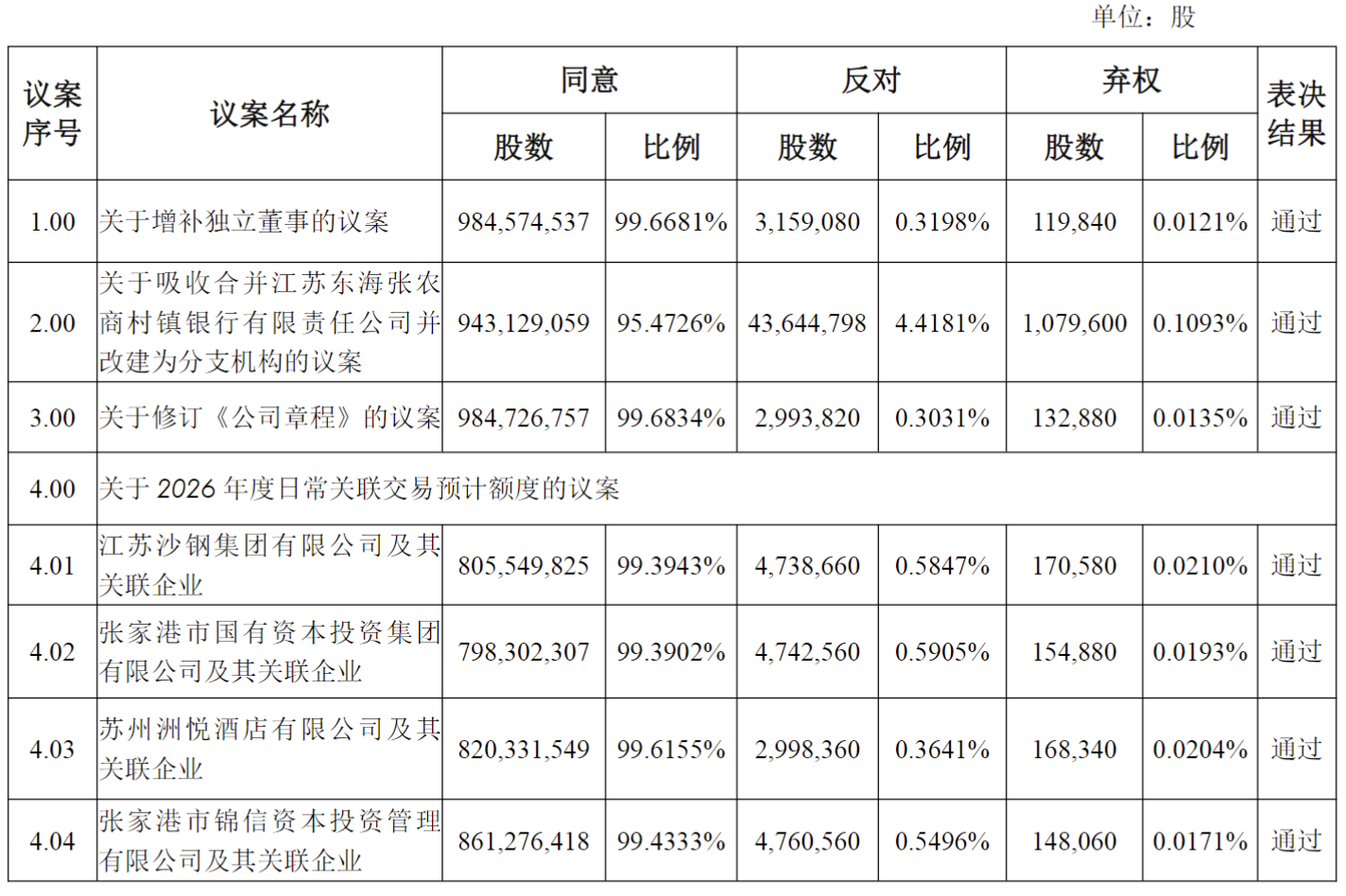 公司重大决议 - 江苏张家港农商行于2026年第一次临时股东会审议通过了《关于吸收合并江苏东海张农商村镇银行有限责任公司并改建为分支机构的议案》[1][3] - 该吸收合并议案获得了95.4726%的同意票,以943,129,059股通过,反对票比例为4.4181%,弃权票比例为0.1093%[2][4] - 股东会同时以高票通过了关于增补独立董事、修订《公司章程》以及2026年度与四家主要关联企业的日常关联交易预计额度等多项议案[2][4] 被合并子公司信息 - 被吸收合并的江苏东海张农商村镇银行是张家港农商行的控股子公司,张家港农商行出资1530万元,持有其51%的股权[1][3] - 该村镇银行注册资本为3000万元,于2008年12月获原中国银行业监督管理委员会连云港监管分局批复开业[1][3] 关联交易情况 - 2026年度,公司与江苏沙钢集团有限公司及其关联企业的日常关联交易预计额度议案获得99.3943%的同意票通过[2][4] - 公司与张家港市国有资本投资集团有限公司及其关联企业的关联交易议案获得99.3902%的同意票通过[2][4] - 公司与苏州洲悦酒店有限公司及其关联企业的关联交易议案获得99.6155%的同意票通过[2][4] - 公司与张家港市铝信资本投资管理有限公司及其关联企业的关联交易议案获得99.4333%的同意票通过[2][4]