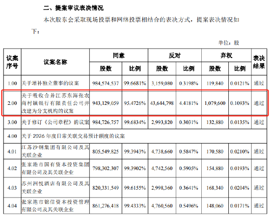 吸收合并决议 - 江苏张家港农商行于2026年1月21日召开临时股东会,审议通过了《关于吸收合并江苏东海张农商村镇银行有限责任公司并改建为分支机构的议案》[1] - 该吸收合并议案获得了95.4726%的同意票,反对票比例为4.4181%[2] 被合并方背景 - 被合并方江苏东海张农商村镇银行有限责任公司成立于2008年12月23日,由江苏张家港农村商业银行股份有限公司发起设立[1] - 该村镇银行注册资本于2024年6月19日由9360万元增至9547.2万元[1] 合并计划进程 - 主发起行张家港行于2025年至2026年期间,启动了吸收合并该村镇银行的“村改支”计划[1] - 张家港行于2026年1月5日公告,将于1月21日召开临时股东会审议此吸收合并议案[1] 股权变动情况 - 股东连云港金控集团于2026年1月5日至30日,将其持有的江苏东海张农商村镇银行10%股权在连云港产权交易所公开挂牌转让[1] 其他股东会议案 - 股东会同时审议通过了关于增补独立董事的议案,同意票比例为99.6681%[2] - 股东会审议通过了关于修订《公司章程》的议案,同意票比例为99.6834%[2] - 股东会审议通过了2026年度与多家关联企业的日常关联交易预计额度议案,包括江苏沙钢集团有限公司及其关联企业(同意票99.3943%)、张家港市国有资本投资集团有限公司及其关联企业(同意票99.3902%)、苏州洲悦酒店有限公司及其关联企业(同意票99.6155%)、张家港市锦信资本投资管理有限公司及其关联企业(同意票99.4333%)[2]