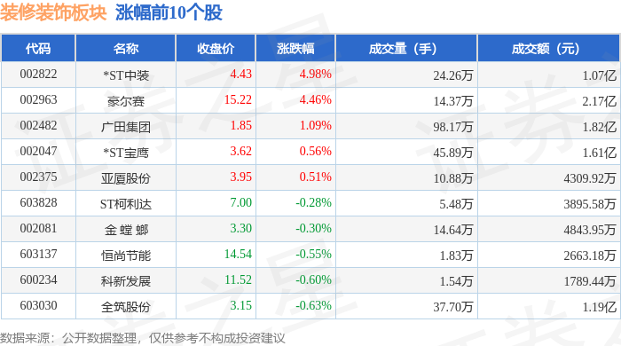 板块整体表现 - 装修装饰板块在报告当日整体下跌1.11%,表现弱于上证指数(下跌0.15%)但弱于深证成指(上涨1.02%)[1] - 板块内个股表现分化明显,领涨股为*ST中装(上涨4.98%)和豪尔赛(上涨4.46%),领跌股为美芝股份(下跌5.98%)和*ST建艺(下跌5.03%)[1][2] 个股价格变动 - 涨幅居前的个股包括*ST中装(收盘价4.43元,涨幅4.98%)、豪尔赛(收盘价15.22元,涨幅4.46%)和广田集团(收盘价1.85元,涨幅1.09%)[1] - 跌幅显著的个股包括美芝股份(收盘价12.11元,跌幅5.98%)、*ST建艺(收盘价10.76元,跌幅5.03%)和*ST东易(收盘价14.39元,跌幅5.02%)[2] - 郑中设计股价下跌5.00%,成交额高达7.10亿元,为板块内成交额最高的个股之一[2] 资金流向分析 - 装修装饰板块整体呈现主力资金净流出状态,净流出金额为4017.07万元[2] - 与主力资金流出相反,游资资金净流入2496.13万元,散户资金净流入1520.94万元[2] - 海南发展获得主力资金净流入8208.89万元,主力净占比达7.66%,为板块内资金流入最显著的个股[3] - 广田集团和亚厦股份分别获得主力资金净流入1911.92万元和339.71万元,主力净占比分别为10.53%和7.88%[3] - 科新发展主力资金净流出242.72万元,主力净占比为-13.56%,为板块内主力资金流出占比最高的个股[3]