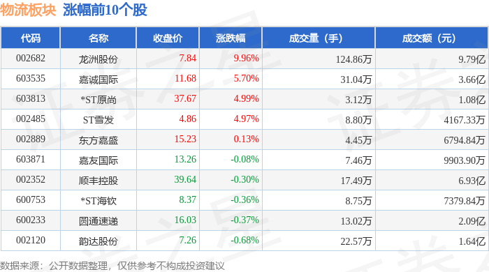 证券之星消息,11月18日物流板块较上一交易日下跌1.32%,炬申股份领跌。当日上证指数报收于 3939.81,下跌0.81%。深证成指报收于13080.49,下跌0.92%。物流板块个股涨跌见下表: 从资金流向上来看,当日物流板块主力资金净流出6.12亿元,游资资金净流入6255.0万元,散户资金净流 入5.5亿元。物流板块个股资金流向见下表: | 代码 | 名称 | 主力净流入(元) | 主力净占比 游资净流入 (元) | | 游资净占比 散户净流入 (元) | | 散户净占比 | | --- | --- | --- | --- | --- | --- | --- | --- | | 603535 喜诚国际 | | 5466.85万 | 14.92% | -1072.58万 | -2.93% | -4394.26万 | -11.99% | | 002682 龙洲股份 | | 4613.78万 | 4.71% | -6362.58万 | -6.50% | 1748.80万 | 1.79% | | 603813 *ST原尚 | | 1389.40万 | 12.85% | -553.59万 | -5.12% | ...