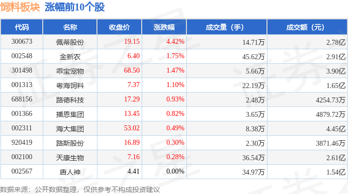 饲料板块市场表现 - 2025年1月14日,饲料板块整体上涨0.22%,表现强于上证指数(下跌0.31%),但弱于深证成指(上涨0.56%)[1] - 板块内个股表现分化,佩蒂股份以4.42%的涨幅领涨,金新农上涨1.75%,乖宝宠物上涨1.47%[1] - 同时有多只个股下跌,天马科技下跌1.81%,傲农生物下跌1.34%,正虹科技下跌0.88%[2] 个股交易数据 - 佩蒂股份收盘价19.15元,成交额2.78亿元,成交量14.71万手[1] - 海大集团收盘价53.02元,成交额4.45亿元,成交量8.38万手[1] - 大北农成交额4.97亿元,成交量122.50万手,为当日板块成交额最高个股[2] - 傲农生物成交量87.97万手,为当日板块成交量最高个股[2] 板块资金流向 - 当日饲料板块整体呈现主力资金净流出8966.45万元[2] - 游资资金净流入2336.94万元,散户资金净流入6629.51万元[2] - 乖宝宠物获得主力资金净流入1980.55万元,主力净占比5.08%,为板块最高[3] - 海大集团获得主力资金净流入1203.45万元,主力净占比2.71%[3] - 粤海饲料获得主力资金净流入1115.04万元,主力净占比6.78%[3] - 路斯股份主力资金净流出88.14万元,主力净占比-2.28%,游资净流出437.69万元,游资净占比-11.31%[3]