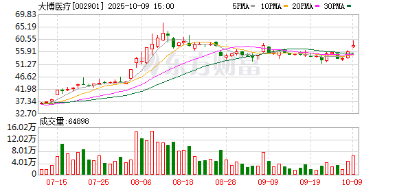 证券之星消息,截至2025年10月9日收盘,大博医疗(002901)报收于58.18元,上涨3.89%,换手率 2.25%,成交量6.49万手,成交额3.79亿元。 10月9日的资金流向数据方面,主力资金净流入2256.49万元,占总成交额5.95%,游资资金净流入 842.99万元,占总成交额2.22%,散户资金净流出3099.49万元,占总成交额8.18%。 近5日资金流向一览见下表: 资金流向名词解释:指通过价格变化反推资金流向。股价处于上升状态时主动性买单形成的成交额是推 动股价上涨的力量,这部分成交额被定义为资金流入,股价处于下跌状态时主动性卖单产生的的成交额 是推动股价下跌的力量,这部分成交额被定义为资金流出。当天两者的差额即是当天两种力量相抵之后 剩下的推动股价上升的净力。通过逐笔交易单成交金额计算主力资金流向、游资资金流向和散户资金流 向。 注:主力资金为特大单成交,游资为大单成交,散户为中小单成交 该股主要指标及行业内排名如下: | 指标 | 大博医疗 | 医疗器械行业均值 | 行业排名 | | --- | --- | --- | --- | | 总市值 | 240.88亿元 | 121.7 ...