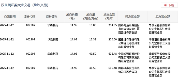 | 权益类证券大宗交易(协议交易) | | | | | | | 团 下载 | | --- | --- | --- | --- | --- | --- | --- | --- | | 交易日期 | 证券代码 | 证券简称 | 成交价格 (元) | 成交量 (万股/万份) | 成交金额 (万元) | 买方营业部 | 卖方营业部 | | 2025-11-14 | 002907 | 华森制药 | 15.28 | 13.10 | 200.17 机构专用 | | 华泰证券股份有限 | | | | | | | | | 公司宜都长江大道 | | | | | | | | | 证券营业部 | 11月14日,华森制药大宗交易成交13.1万股,成交额200.17万元,占当日总成交额的1%,成交价15.28 元,较市场收盘价17.34元折价11.88%。 ...
