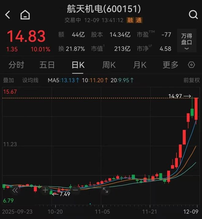 另外,国家航天局已于近期设立商业航天司,相关业务正在逐步开展,标志着我国商业航天产业迎来专 职监管机构,未来将持续推动我国商业航天高质量发展,产业链有望全线受益。 本报记者 梁傲男 12月12日,商业航天板块走强,10余只个股集体涨停、多股连板,市场热度持续升温。 截至上午收盘,再升科技(603601)、华菱线缆(001208)、长城电工(600192)、航天长峰 (600855)、四创电子(600990)、顺灏股份(002565)、雪人集团(002639)、泰永长征 (002927)、东方通信(600776)、泰尔股份(002347)、中超控股(002471)11只概念股涨停。其 中,再升科技达成5连板,华菱线缆、雪人集团、中超控股达成2连板。 此外,天力复合(920576)涨超20%,超捷股份(301005)、国瓷材料(300285)、创远信科 (920961)、苏轴股份(920418)股价上涨超10%。 | | 代码 | 名称 | 涨幅% v | 现价 | 主力净量 | 主力净流入 | 涨跌 | | --- | --- | --- | --- | --- | --- | --- | --- | | 1 ...