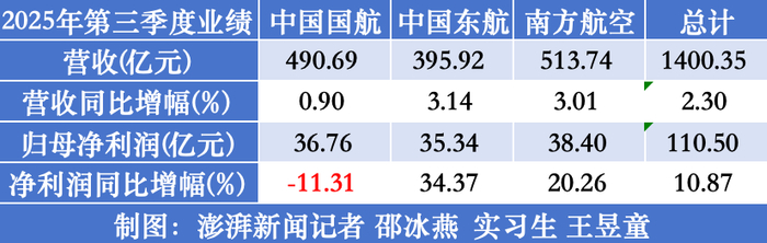 七家航司前三季度均实现盈利,但航司业绩增速分化。 近日,中国国航(601111.SH)、中国东航(600115.SH)、南方航空(600029.SH)三大航空央企,以 及海航控股(600221.SH)、春秋航空(601021.SH)、吉祥航空(603885.SH)、华夏航空 (002928.SZ)四家民营航司,共七家A股上市航司陆续披露完2025年第三季度业绩公告,七家航司第 三季度单季以及前三季度均实现盈利。 据智通财经记者计算,第三季度国航、东航、南航(以下简称"国东南"或"三大航")营收超1400亿元, 同比增超2%;净利润超110亿元,同比增超一成。前三季度三大航营收共计约3739亿元,同比增超 2%;净利润超62亿元,同比增超九成。 民营航司方面,第三季度海航、春秋、吉祥、华夏四家航司营收合计超353亿元,同比增超2%;净利润 超49亿元,同比下滑超4%。前三季度营收超934亿元,同比增超3%;净利润近69亿元,同比增长8%。 截至11月3日收盘,今年以来中国国航(601111.SH)涨超2%;南方航空(600029.SH)和海航控股 (600221.SH)涨超7%;中国东航(600115.SH)涨 ...