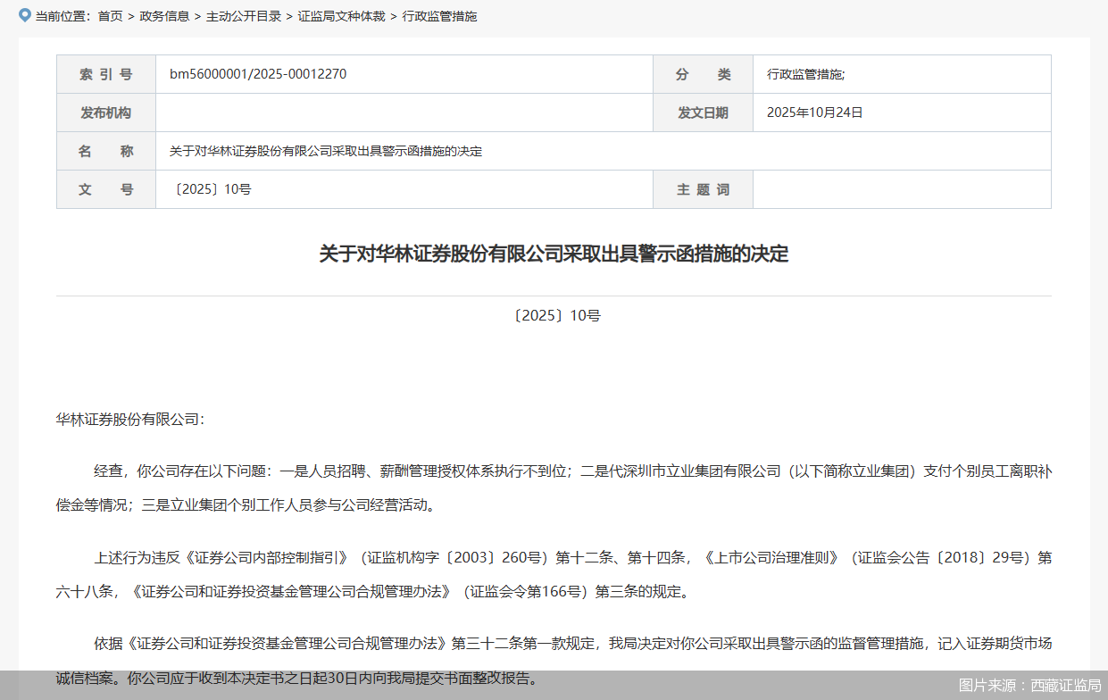 监管处罚决定 - 西藏证监局对华林证券采取出具警示函的监督管理措施 [1][2] - 该监管措施将被记入证券期货市场诚信档案 [1][2] - 公司需在收到决定书之日起30日内提交书面整改报告 [2] 公司违规问题 - 人员招聘及薪酬管理授权体系执行不到位 [1][2] - 代主要股东立业集团支付个别员工离职补偿金 [1][2] - 立业集团个别工作人员参与公司经营活动,显示公司治理独立性存在缺陷 [1][2] 违反的监管规定 - 违反《证券公司内部控制指引》第十二条及第十四条 [1][2] - 违反《上市公司治理准则》第六十八条 [1][2] - 违反《证券公司和证券投资基金管理公司合规管理办法》第三条 [1][2]