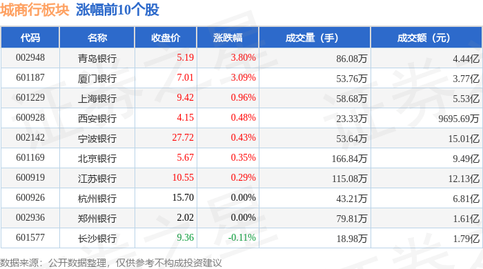 | 代码 | 名称 | 收盘价 | 涨跌幅 | 成交量(手) | 成交额(元) | | --- | --- | --- | --- | --- | --- | | 601838 | 成都银行 | 16.86 | -1.23% | 62.06万 | 10.53亿 | | 001227 | 兰州银行 | 2.40 | -0.83% | 43.23万 | 1.04亿 | | 6001009 | 南京银行 | 11.06 | -0.72% | 70.29万 | 7.83亿 | | 002966 | 苏州银行 | 8.13 | -0.49% | 37.35万 | 3.05亿 | | 601963 | 重庆银行 | 10.72 | -0.37% | 12.83万 | 1.38 Z | | 601665 | 齐鲁银行 | 5.88 | -0.34% | 57.24万 | 3.38亿 | | 601997 | 豊阳银行 | 5.89 | -0.17% | 30.59万 | 1.81亿 | | 601577 | 长沙银行 | 9.36 | -0.11% | 18.98万 | 1.79亿 | | 002936 | 郑州银行 | ...