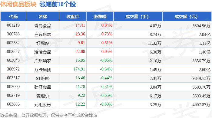 证券之星消息,10月30日休闲食品板块较上一交易日下跌0.94%,西麦食品领跌。当日上证指数报收于 3986.9,下跌0.73%。深证成指报收于13532.13,下跌1.16%。休闲食品板块个股涨跌见下表: | 代码 | 名称 | 收盘价 | 涨跌幅 | 成交量(手) | 成交额(元) | | --- | --- | --- | --- | --- | --- | | 001219 | 青岛食品 | 14.41 | 0.84% | 4.02万 | 5804.96万 | | 300783 | 三只松鼠 | 23.36 | 0.73% | 8.74万 | 2.04亿 | | 002582 | 好想你 | 9.81 | 0.51% | 11.32万 | 1.11亿 | | 002557 | 治治食品 | 22.08 | 0.05% | 6.30万 | 1.40亿 | | 603043 | 广州酒家 | 15.95 | -0.06% | 2.10万 | 3356.79万 | | 300972 | 万辰集团 | 174.91 | -0.34% | 1.49万 | 2.60亿 | | 603517 | ST绝味 | 13 ...