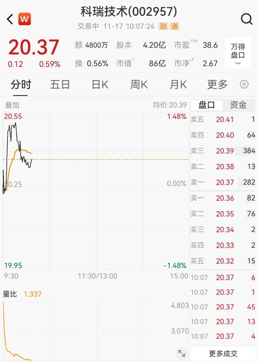 21财经·南财快讯记者以投资者身份致电科瑞技术,公司证券部工作人员进一步指出,公司确实有为新凯来供应半导体方面的零 部件和设备,但不单单是新凯来,"国内外比较大的(半导体公司)我们都有合作。目前订单都挺多的,基本上排到明年了。" 据悉,新凯来作为深圳市重点支持的半导体企业,主营半导体装备及零部件、电子制造设备的研发、制造、销售与服务,自成 立以来备受资本市场关注。此前,在2025湾区半导体产业生态博览会上,新凯来旗下公司宣布了两个新品:一个是EDA相关产 品,填补了国产高端电子设计工业软件技术空白;一个是超高速实时示波器,将国产示波器性能提升到500%。新品发布后引发 相关概念股异动。 公开资料显示,科瑞技术主要从事工业自动化设备的研发、设计、生产、销售和技术服务,以及精密零部件制造业务,是工业 自动化设备及智能制造整体解决方案的全球供应商。 今天早盘,科瑞技术股价窄幅震荡,截至10:07,报20.37元/股,涨0.59%,总市值为86亿元。 | < W | 科瑞技术(002957) | | | | | | --- | --- | --- | --- | --- | --- | | 交易中 11-17 10: ...