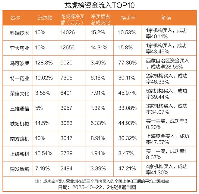 市场整体表现 - 10月22日,上证指数下跌0.07%,深证成指下跌0.62%,创业板指下跌0.79% [1] - 当日共有46只个股因异动登上龙虎榜,其中20只被净买入,26只被净卖出 [1]   龙虎榜资金流向 - 资金净流入最多的个股为科瑞技术,净买入额达1.4亿元,占总成交金额的15.2%,该股当日收盘上涨10%,换手率为10.53% [1] - 资金净流出最多的个股为合锻智能,净卖出额为1.18亿元,占总成交金额的3.72%,该股当日收盘上涨2.55%,换手率为27.33% [4] - 其他资金净买入显著的个股包括亚太药业(净买入1.27亿元,占成交额14.31%)和司可波罗(净买入9020万元,占成交额3.49%) [2]   机构资金动向 - 24只个股龙虎榜出现机构身影,机构合计净买入2322.62万元,其中净买入12股,净卖出12股 [6] - 机构净买入金额最多的个股是荣信文化,净买入额为1.11亿元,占总成交金额的13.66%,该股当日上涨3.56%,换手率为45.97% [7][8] - 机构净卖出金额最多的个股是蓝丰生化,净卖出额为7355万元,占总成交金额的5.34%,该股当日上涨10.05%,换手率为55.72% [9][10]   北向资金动向 - 北向资金参与龙虎榜个股共14只,合计净卖出1.65亿元,其中沪股通净卖出9281.36万元,深股通净卖出7196.21万元 [10] - 北向资金净买入金额最多的个股是三维通信,净买入4811.74万元,占总成交金额的1.6% [11] - 北向资金净卖出金额最多的个股是海峡股份,净卖出1.44亿元,占总成交金额的6.31%,该股当日下跌7.55% [11]   机构与北向资金共同行动 - 机构和北向资金共同净买入三维通信、科博达、特一药业,合计净买入额分别为7113万元、6510万元、6224万元 [15] - 机构和北向资金共同净卖出科瑞技术、海马汽车,合计净卖出额分别为721万元、5672万元 [15] - 在湖南白银、华谊集团、海峡股份上出现分歧,例如机构净买入海峡股份2103万元,而北向资金净卖出该股1.44亿元 [13][15]