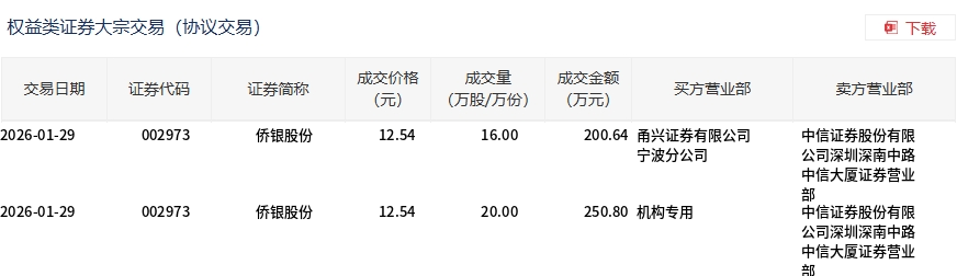 侨银股份大宗交易概况 - 2026年1月29日,侨银股份发生大宗交易,总成交36万股,总成交额451.44万元,占该股当日总成交额的4.78% [1] - 本次大宗交易成交均价为12.54元,较当日市场收盘价14.11元折价11.13% [1] 交易明细分析 - 当日共发生两笔大宗交易,成交价格均为12.54元 [2] - 第一笔成交量为16万股,成交额为200.64万元,买方为甬兴证券有限公司宁波分公司,卖方为中信证券股份有限公司深圳深南中路中信大厦证券营业部 [2] - 第二笔成交量为20万股,成交额为250.80万元,买方为“机构专用”席位,卖方同样为中信证券股份有限公司深圳深南中路中信大厦证券营业部 [2]