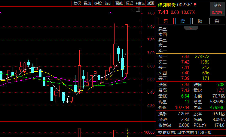 早盘,光刻机概念异动拉升,凯美特气(002549)、奥普光电(002338)涨停,新莱应材、蓝英装备、苏大维格等冲高。 | 凯美特气 | | | | | --- | --- | --- | --- | | 002549 融 深股通 L1 | | | | | 22.23 | 22.23 름 | 市值 154.58亿 量比 | 24.85 8.32% | | વિદ્ | 21.41 | 流通 153.91亿 换 | | | 2.02 10.00% | チ 21.51 | 市容 TTM 257.14 额 | 12.67亿 | | 同花顺 异动解读:电子特气 + 三季报扭亏 + 光刻机认... 糖能 | | | | | 目K 分时 | 日K 園K | 五日 重零。 | | | 均价: 21.99 最新: 22.23 2.02 10.00% | | | | | 22.23 | | 10.00% 五档 | 成交 | | | | 首板 封单占成交 108.86% | | | | | 最高封单额 17.84亿 | | | 20.21- | | -0.00% 涨停成交额 5.99亿 | | | | | 明涨停概率 点击查看 ...