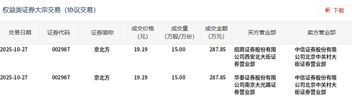 大宗交易概况 - 2025年10月27日,京北方发生大宗交易,总成交量为30万股,总成交金额为575.7万元,占该股当日总成交额的0.85% [1] - 本次大宗交易成交价格为19.19元,较当日市场收盘价21.86元折价12.21% [1] 交易明细分析 - 当日共发生两笔大宗交易,每笔成交量均为15万股,成交金额均为287.85万元 [2] - 两笔交易的成交价格均为19.19元,卖方营业部均为中信证券股份有限公司北京中关村大街证券营业部 [2] - 买方营业部分别为招商证券股份有限公司西安北大街证券营业部和华泰证券股份有限公司南京大光路证券营业部 [2]